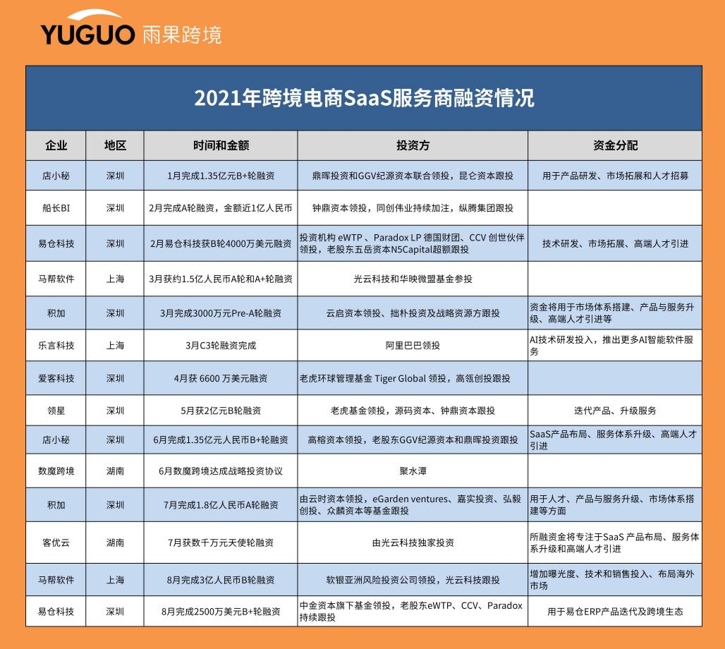 据不完全统计,截至8月,今年跨境电商SaaS赛道累计发生14笔融资,其中不乏一年内融资两次的SaaS服务商。