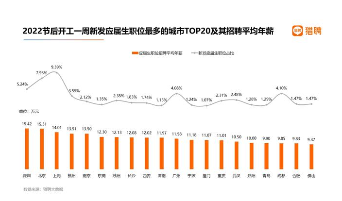 据猎聘大数据研究院《2022春节后开工一周中高端人才就业数据报告》显示,从开工一周应届生新发职位分布最多的TOP20城市来看,深圳位居前三,占比为5.24%。从这20个城市对应的应届生招聘平均年薪来看,深圳位居第一为15.42万。