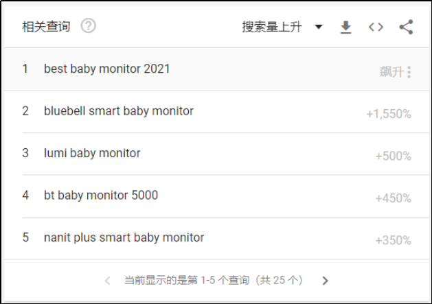 以婴儿监视器(baby monitor)为例,我们从GoogleTrends的趋势了解到,其搜索量一直居高不下,搜索量处于50分以上,热度趋势较为平稳,没有明确淡旺季之分。Google Trends相关查询中,best baby monitor 2021搜索量飙升,由此可见,父母注重婴儿监视器的性能与市场地位。